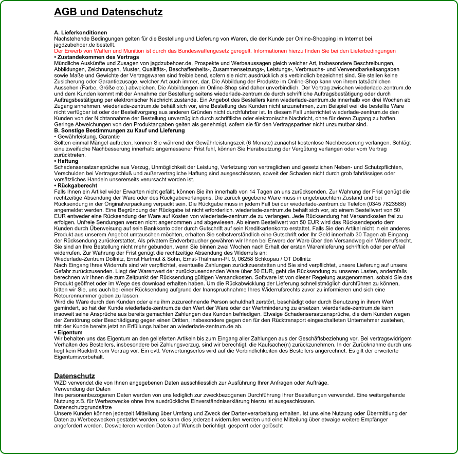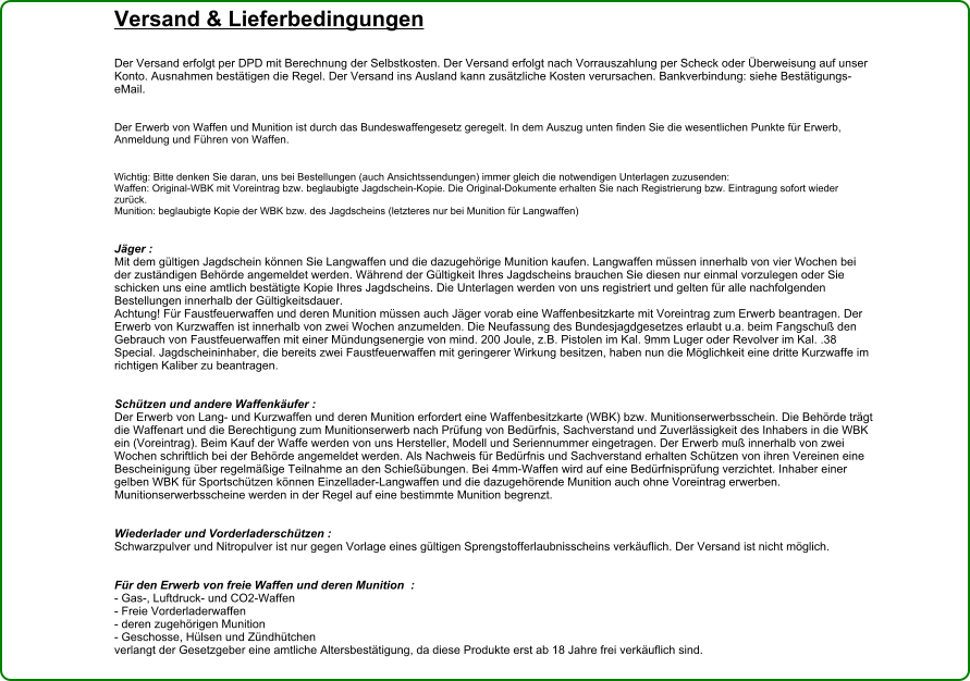 Der Erwerb von Waffen und Munition ist durch das Bundeswaffengesetz geregelt. Informationen hierzu finden Sie bei den Lieferbedingungen